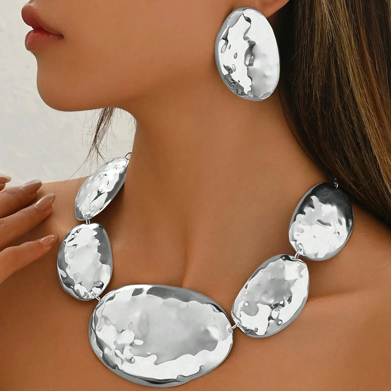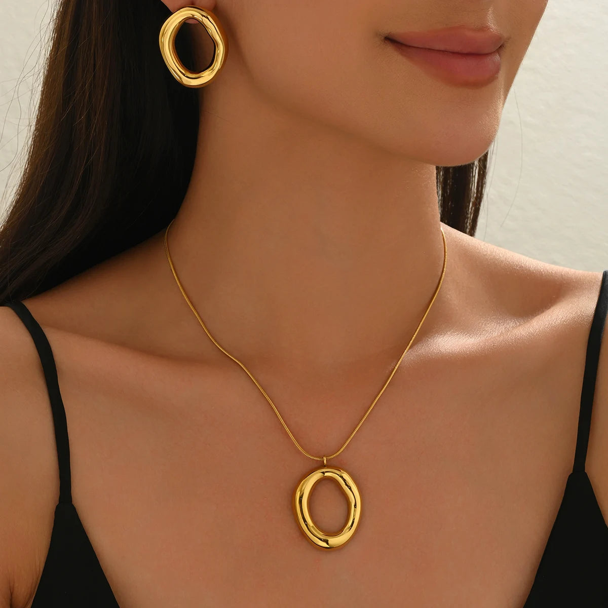 Lxalry 3 fashionable, elegant, exaggerated metal style, geometric oval shape, trendy European and American necklace earrings set