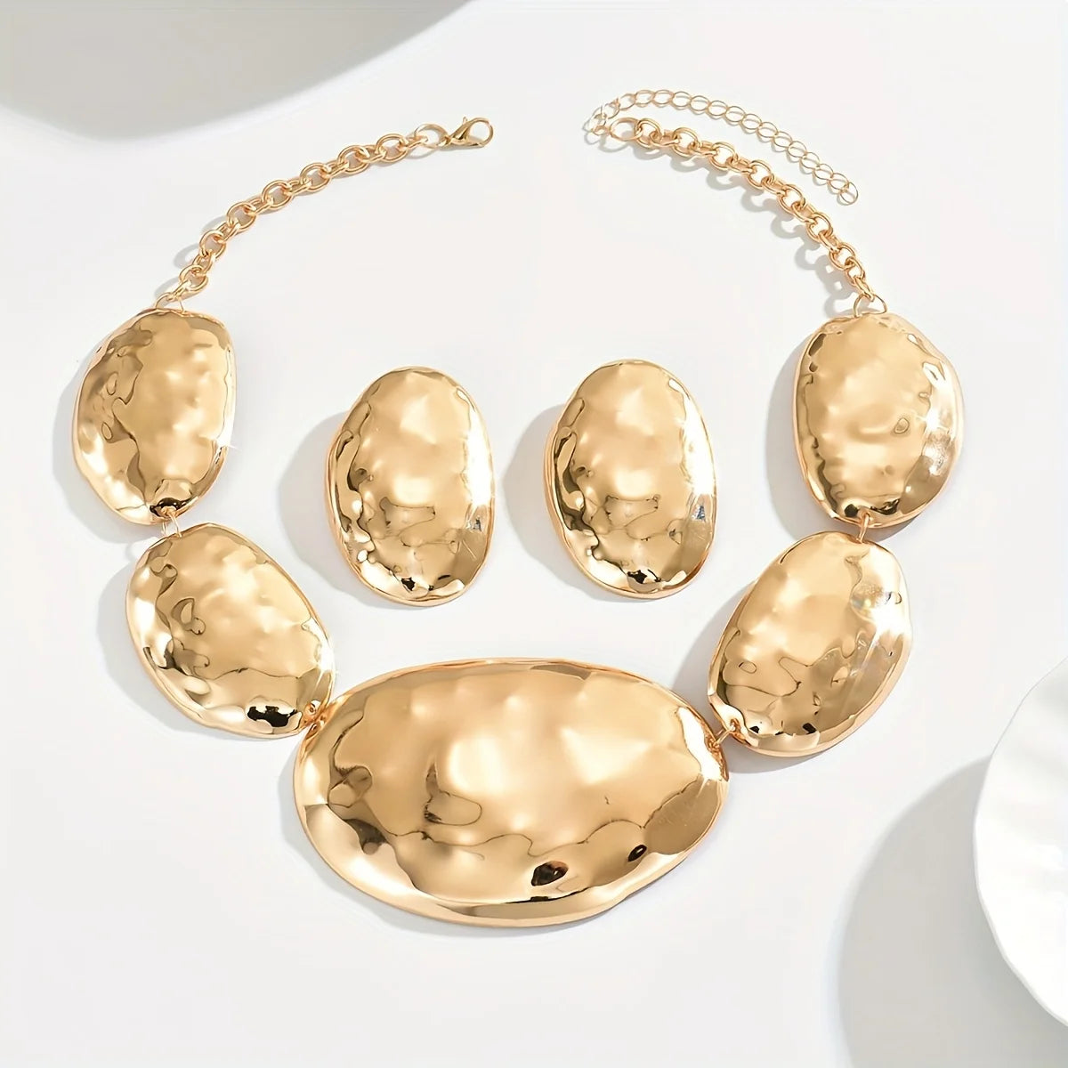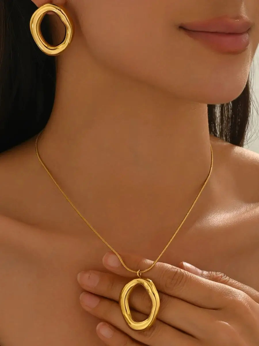 Lxalry 18K Gold Plated Set, Hypoallergenic Necklace & Earrings, Mirror Polish, Organic Round Design, Adjustable