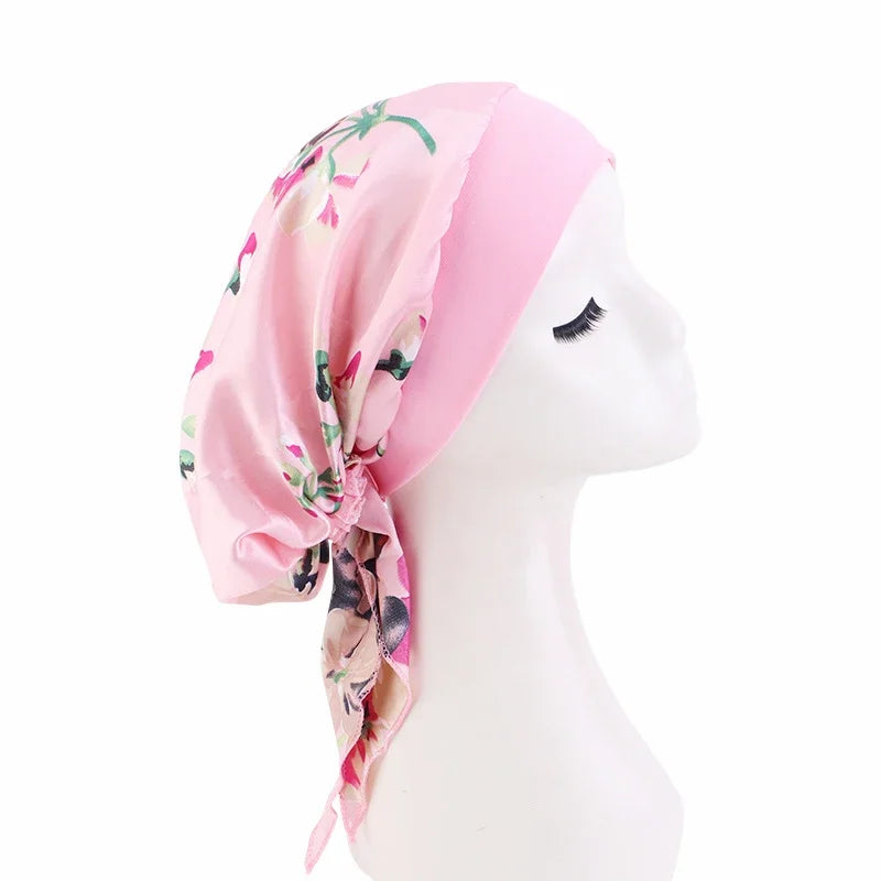 Satin printed headscarf hat for women, elastic wide brimmed nightcap with straps, pirate headband hat