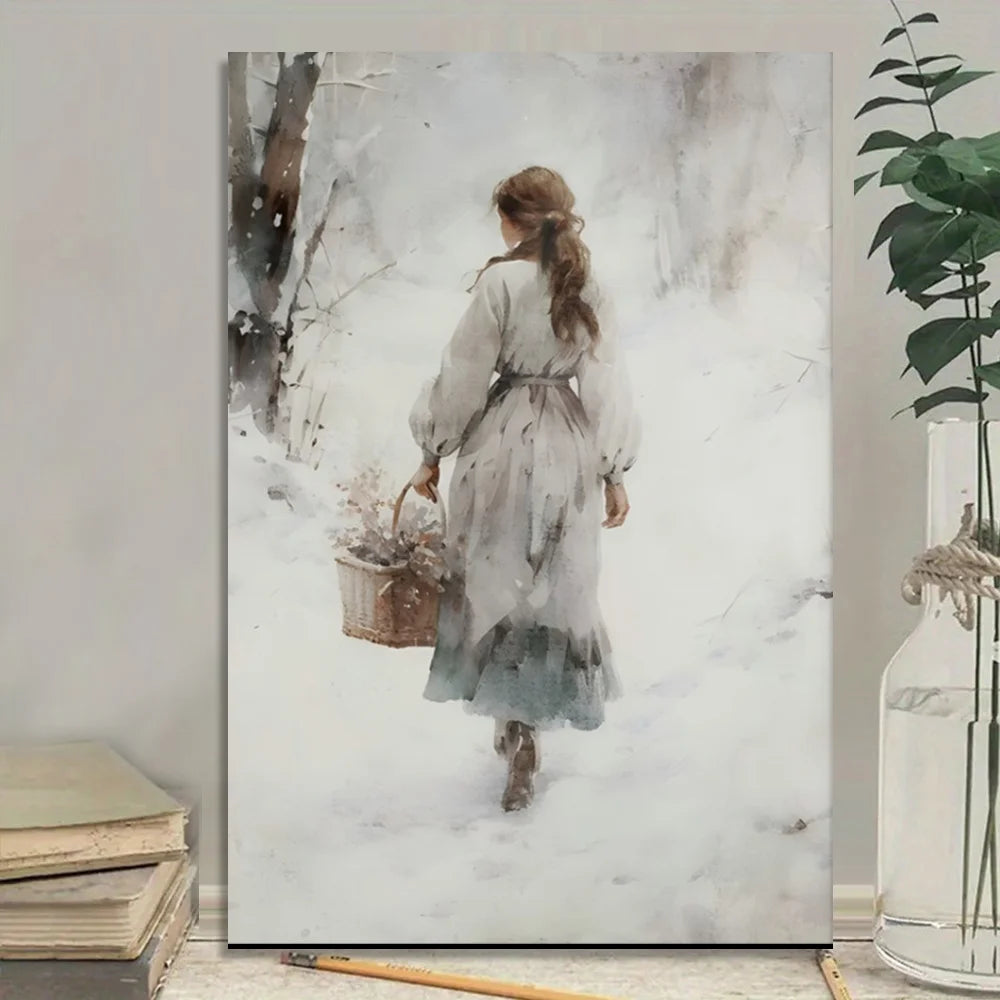 1pc Wooden Framed Canvas Painting winter landscape watercolor painting cottagecore print, vintage christmas wall art winter home
