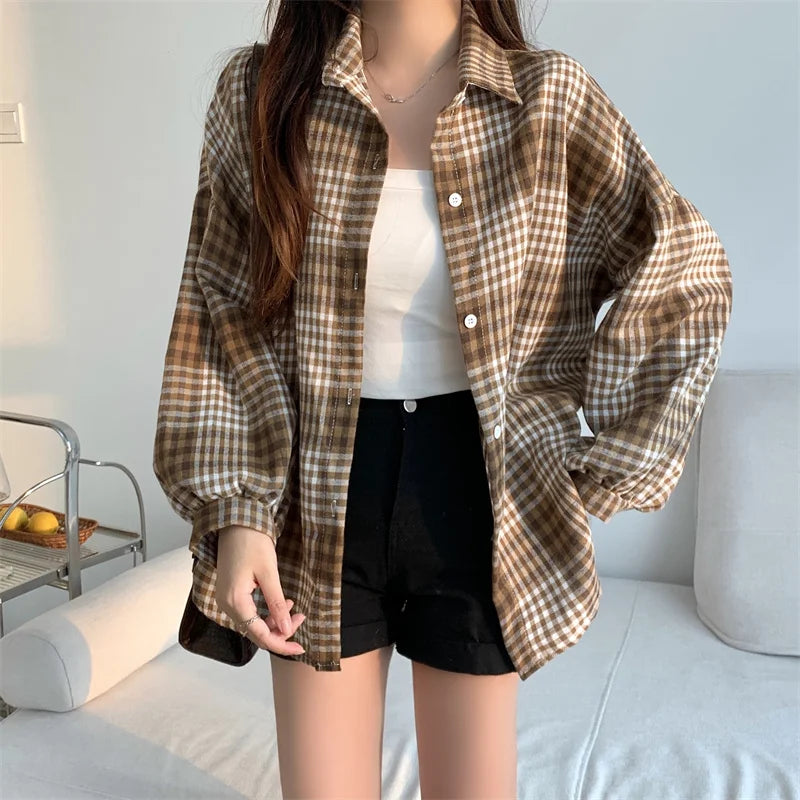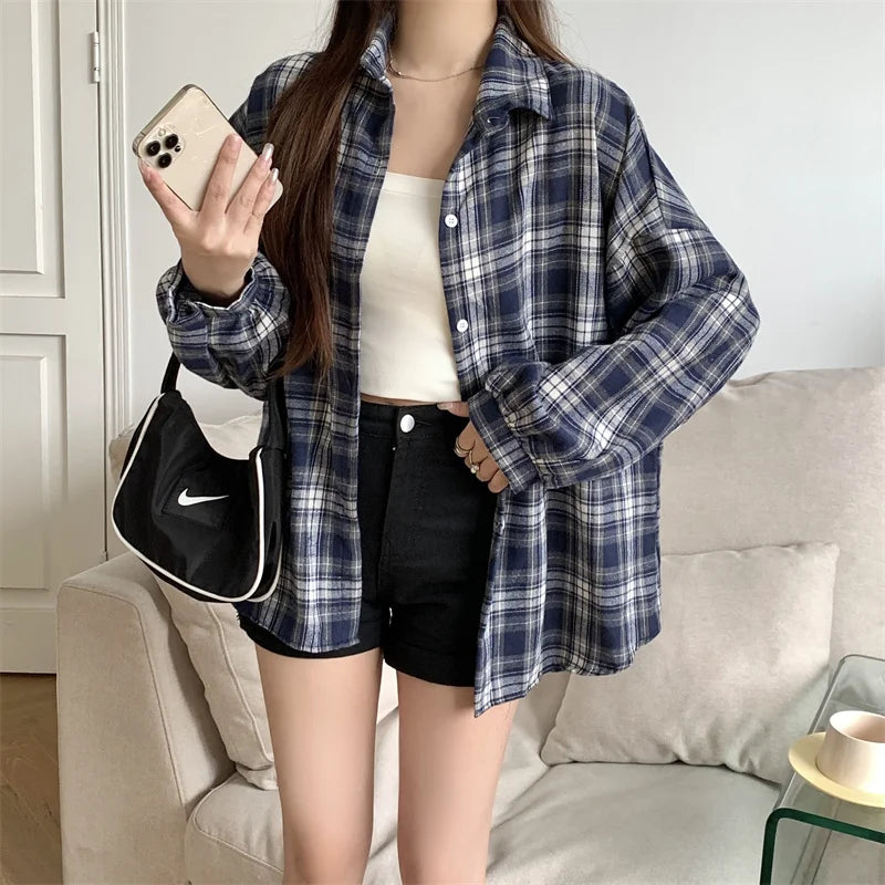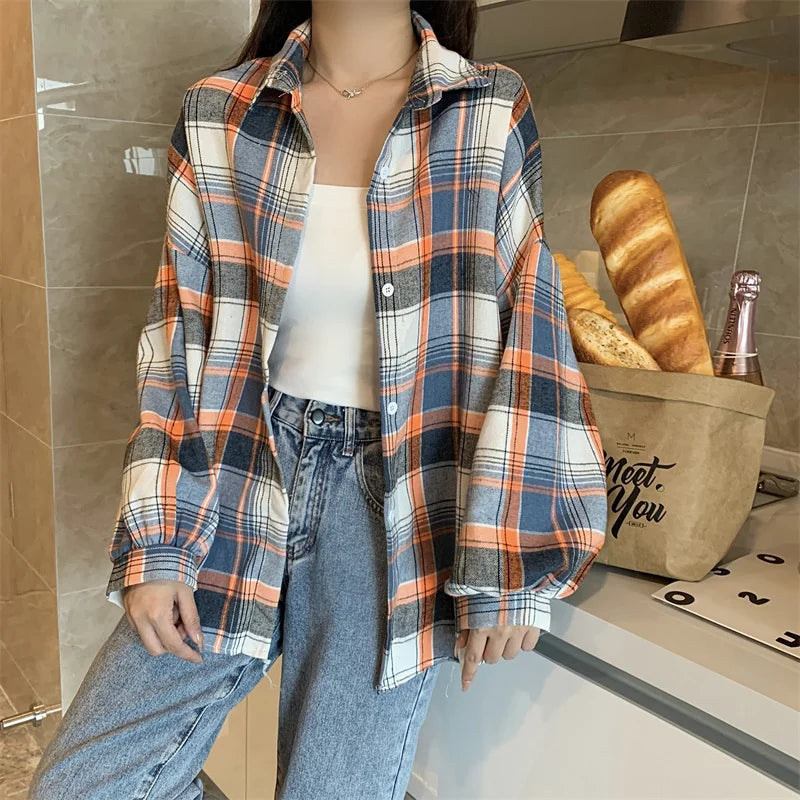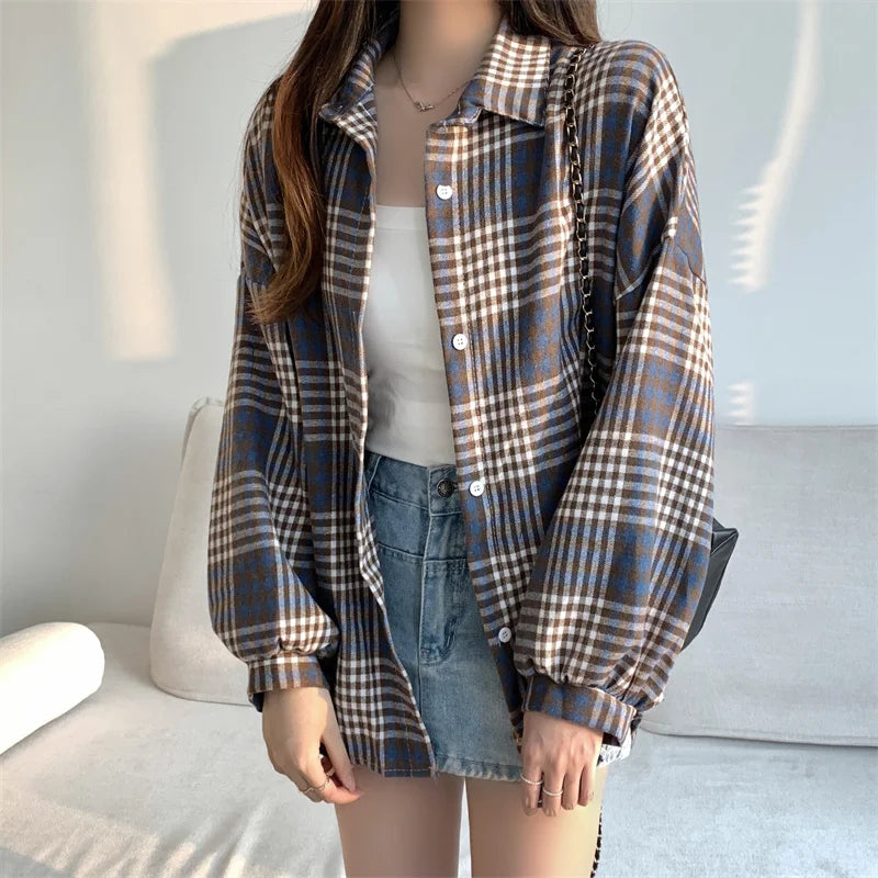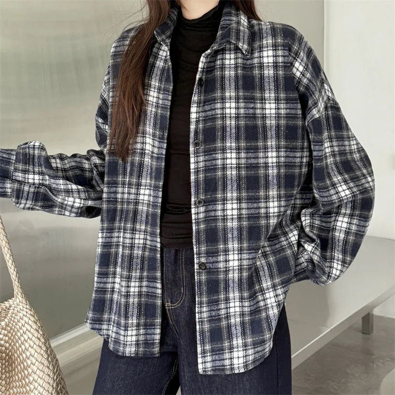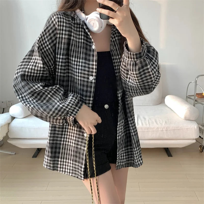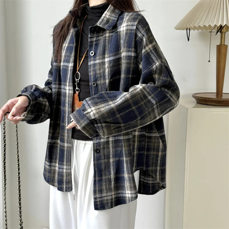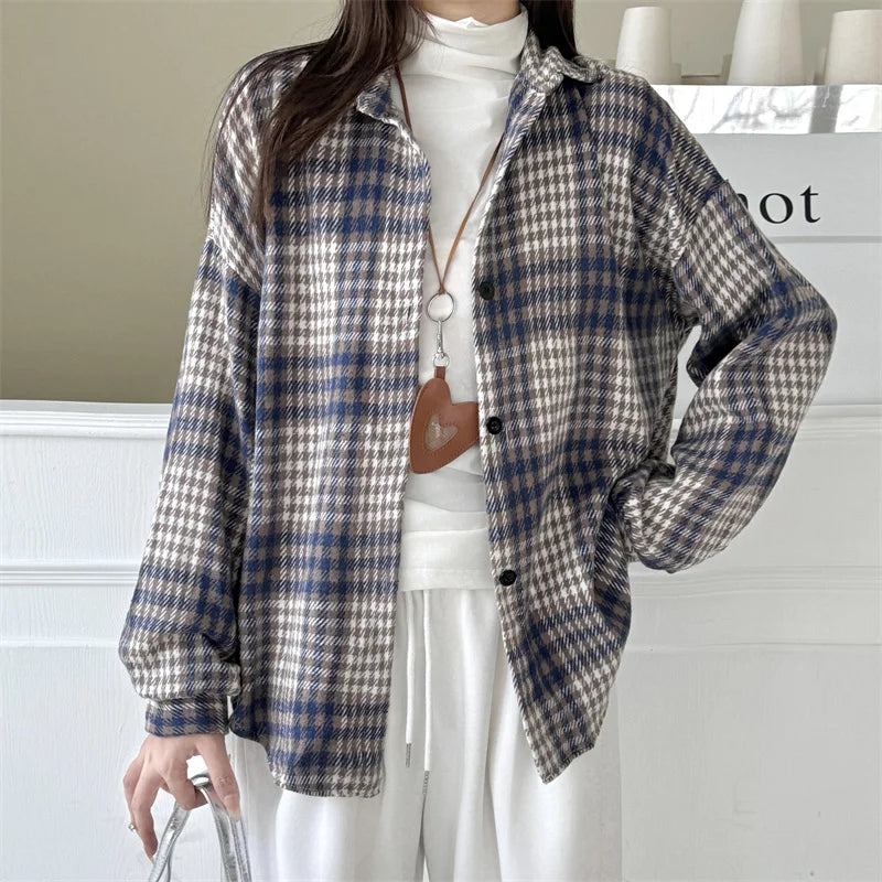 Plaid Shirts Vintage Long Sleeve Oversize Button Up Shirt Korean Fashion Casual Single Breasted Button Blouse Fall Outwear Tops
